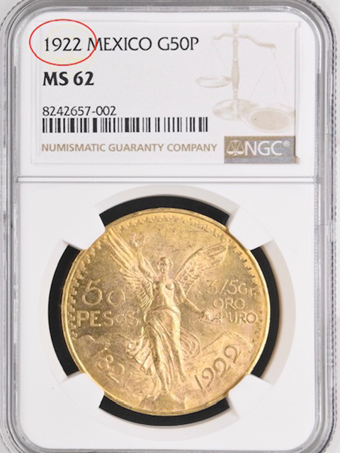 50ペソ金貨は、1943年(鋳造数89000個!)の「復活鋳造」で「デザイン」が、その年号だけ「記念的に」ちょびっと変わっていきます。