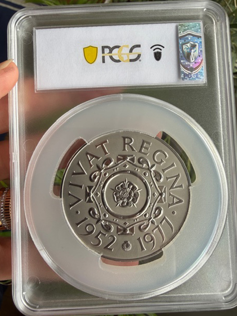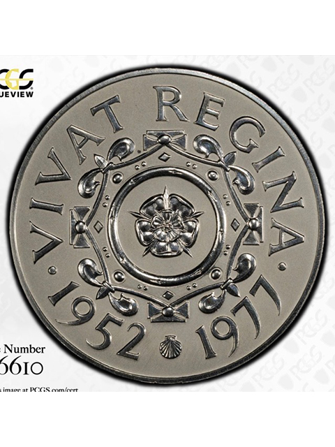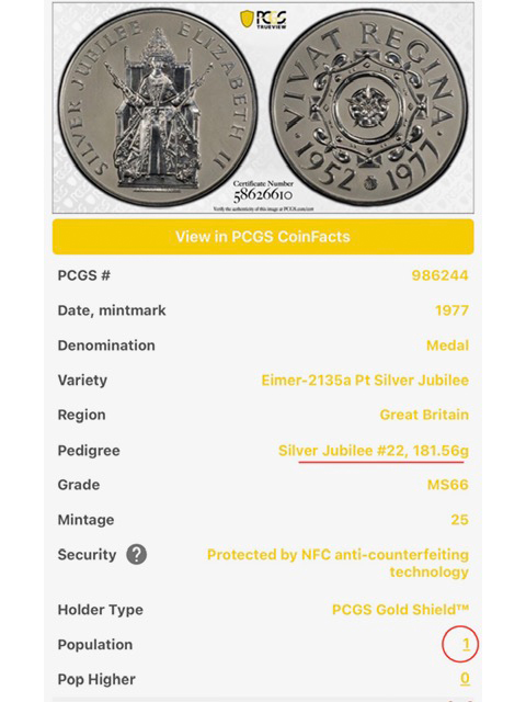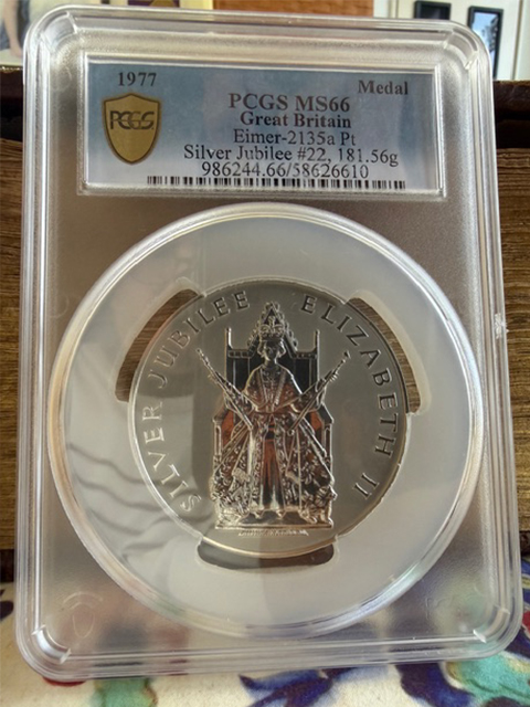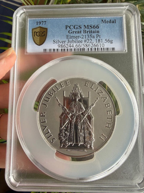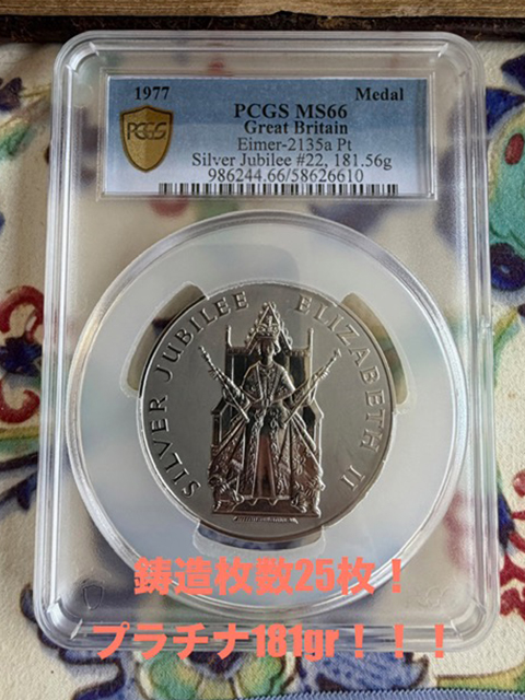 (453)英国 エリザベスII世(在位25周年記念)「1977年」50 Ducat超弩級!英国立ミント!「純プラチナ」メダル「約182gr」PCGS 「MS66」製造枚数: 25枚!!! (クリスマス価格) 2,670,000円 (267万円) 税込