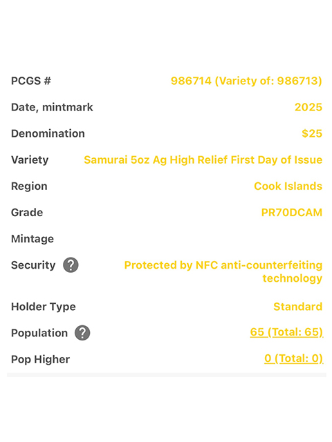 PCGS鑑定結果:All「PR70DCAM」1st day of Issue (鋳造初日)