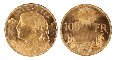 1925年スイス100フラン金貨「アルプスの少女」