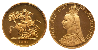 英国 Victoria女王1887年「5ソブリン」大型金貨 NGC PF65 ULTRA CAMEO !!「ジュビリーヘッド」