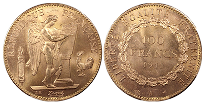 • NEW (175)フランス共和国1911年「100フラン金貨」PCGS/NGC最高鑑定MS65!!