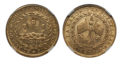 • 2022年5月17日発売 SOLD OUT (290)チリ共和国 1819年「8 Escudos 金貨」全年号唯一無二のFDC「MS65」(垂涎の的: ex.Dr Mooreコレクション!!!)