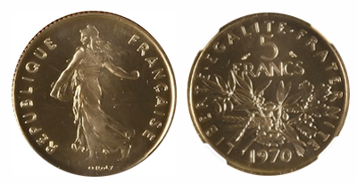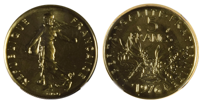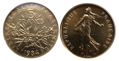 • 売り切れ (61)フランス 1984年 5フランピエフォール金貨 生存4個から唯一鑑定 PF67 !