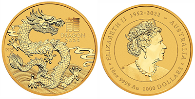 • SOLD OUT (389)「オーストリア造幣局」 (2024年)干支「ドラゴン」「10オンス」大型金貨(311グラム) 完全未使用!