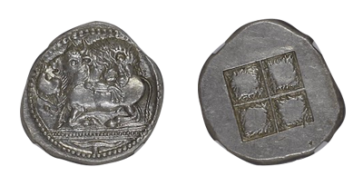 • SOLD OUT (396)古代マケドニア初期の初期! 「ACANTHUS」テトラドラクマ銀貨 (紀元前525年〜470年)唯一無二のMS級「MS Star/Fine Style」! 博物館級!!