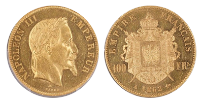 • SOLD OUT (415)フランス帝国 第2帝政 ナポレオン3世 「有冠100フラン金貨」「1862年」 PCGS/NGC「全年号唯一」の「PROOFLIKE」「MS63PL」!