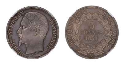 フランス共和国「5フラン銀貨1852年」PF63プラス